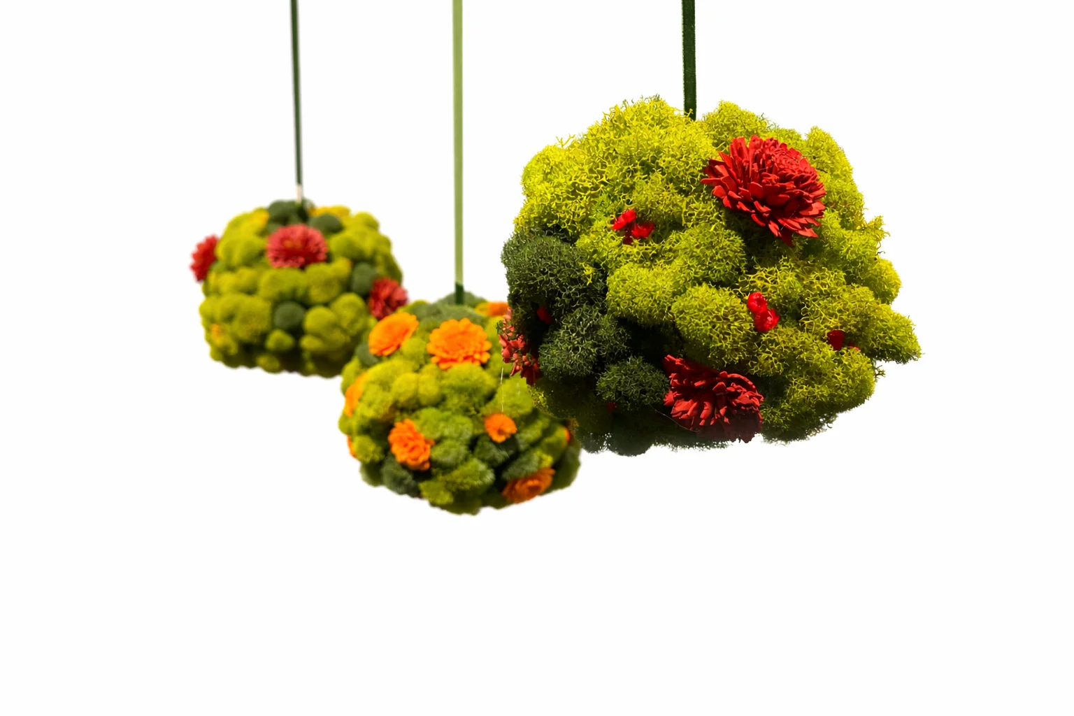 Each moss sphere is carefully assembled using multiple varieties of preserved reindeer moss, accented with multicolored preserved floral elements that add depth, color, and visual interest. The spheres are individually suspended by minimal cords, allowing them to float naturally in space while maintaining a clean architectural presence.